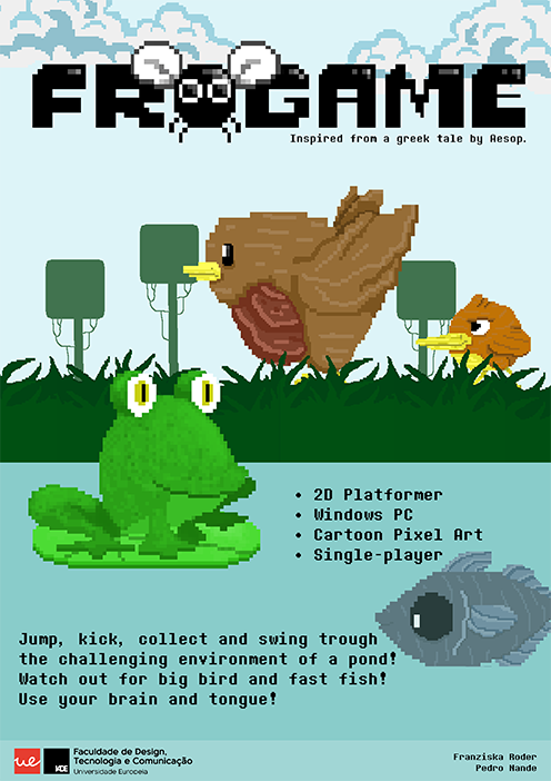 Tools: Löve 2D, PhotoshopIm Wintersemester 2019/2020 studierte ich für ein Erasmussemester Game and App Development an der IADE Lissabon. Gemeinsam mit einem Kommilitonen entwickelte ich ein PC Spiel. Dieses wurde mit der Lua Scripting Language und dem Löve 2D Framework programmiert. Frogame ist das Abschlussprojekt des Semesters.