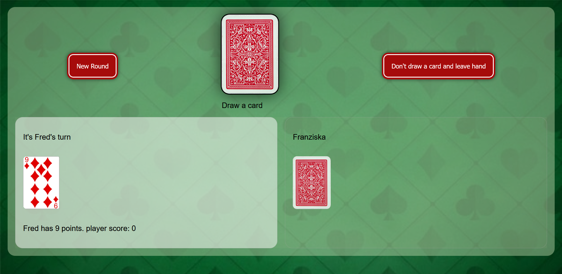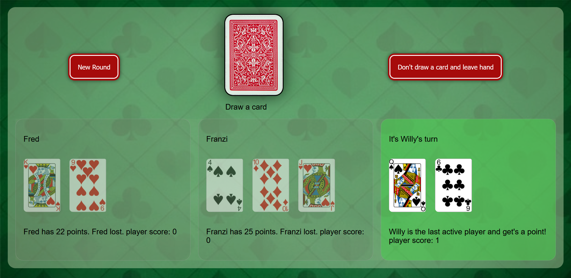 Tools: HTML, Javascript, CSSEine Black Jack Variante im Browser. Mehrere Spieler können gleichzeitig am selben Bildschirm gegeneinander spielen.